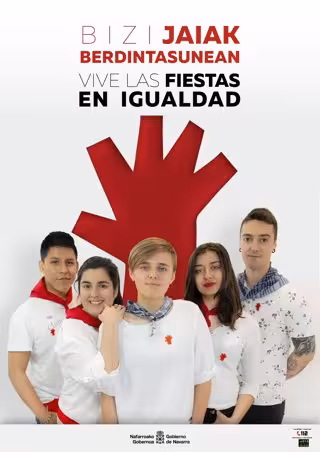 La campaña está compuesta por diferentes elementos y soportes. Así, el cartel de este año representa a una cuadrilla joven, que reivindica su derecho a vivir las fiestas en igualdad, además de visibilizar el símbolo de la mano roja, un símbolo reconocido por la ciudadanía navarra.