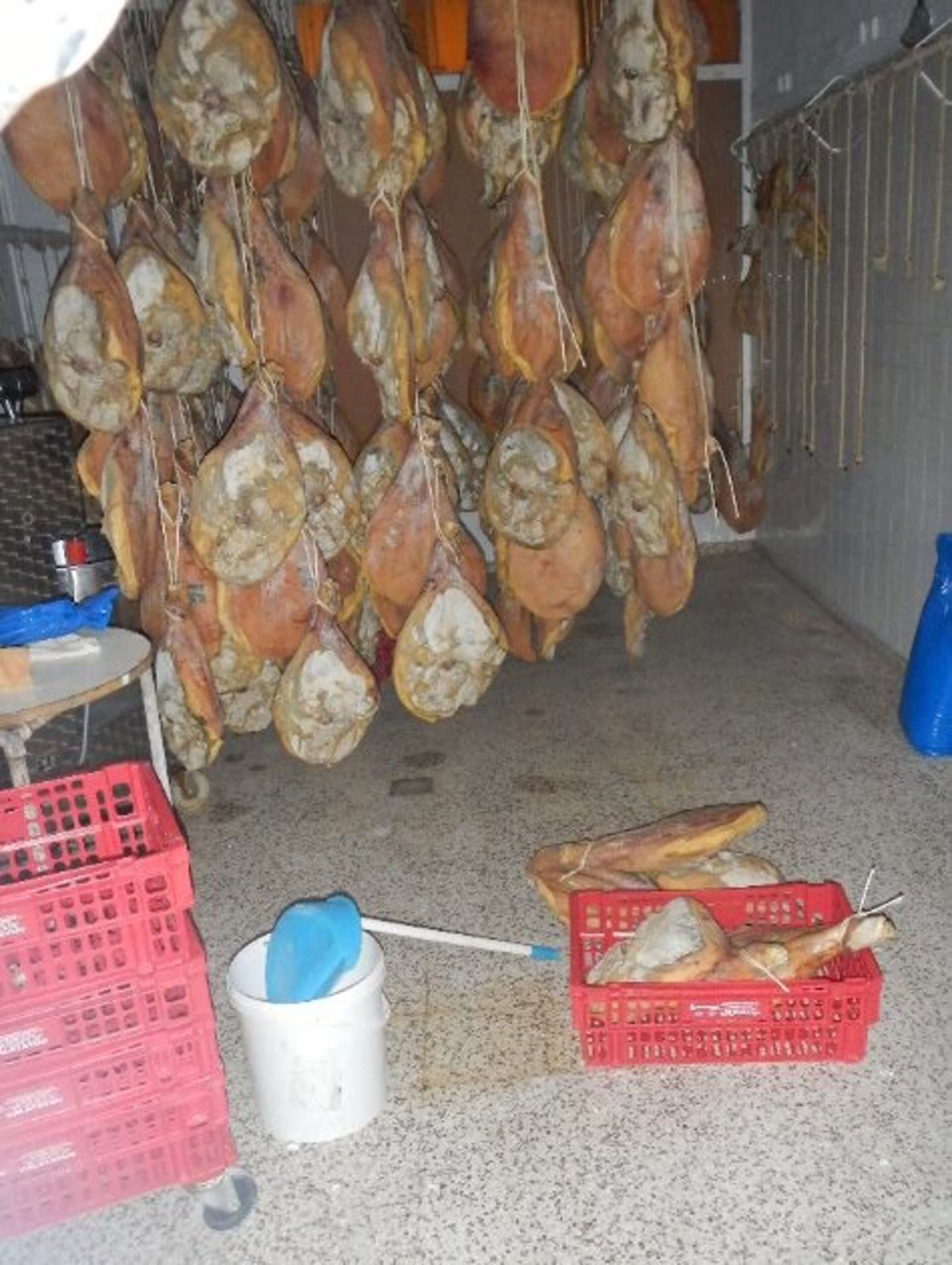 Cuando inspeccionaron el lugar de los hechos, los agentes encontraron varios objetos que portaban (guantes y bolsas de color negro) así como una caja con jamones listos para llevárselos.