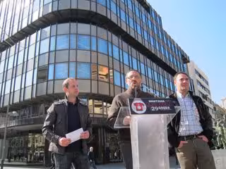 Miembros de las tres formaciones políticas han ofrecido este martes una rueda de prensa frente a la sede central de Caja Navarra en Pamplona para pedir a la ciudadanía que secunde la jornada de paro contra una reforma que "vulnera nuestros derechos más básicos".
