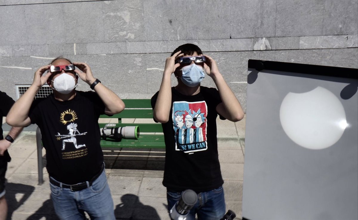 Dos personas contemplan en el exterior del planetario de Pamplona el eclipse solar parcial que se puede apreciar también proyectado en una superficie blanca, a 10 de junio de 2021. - EDUARDO SANZ-EUROPA PRESS