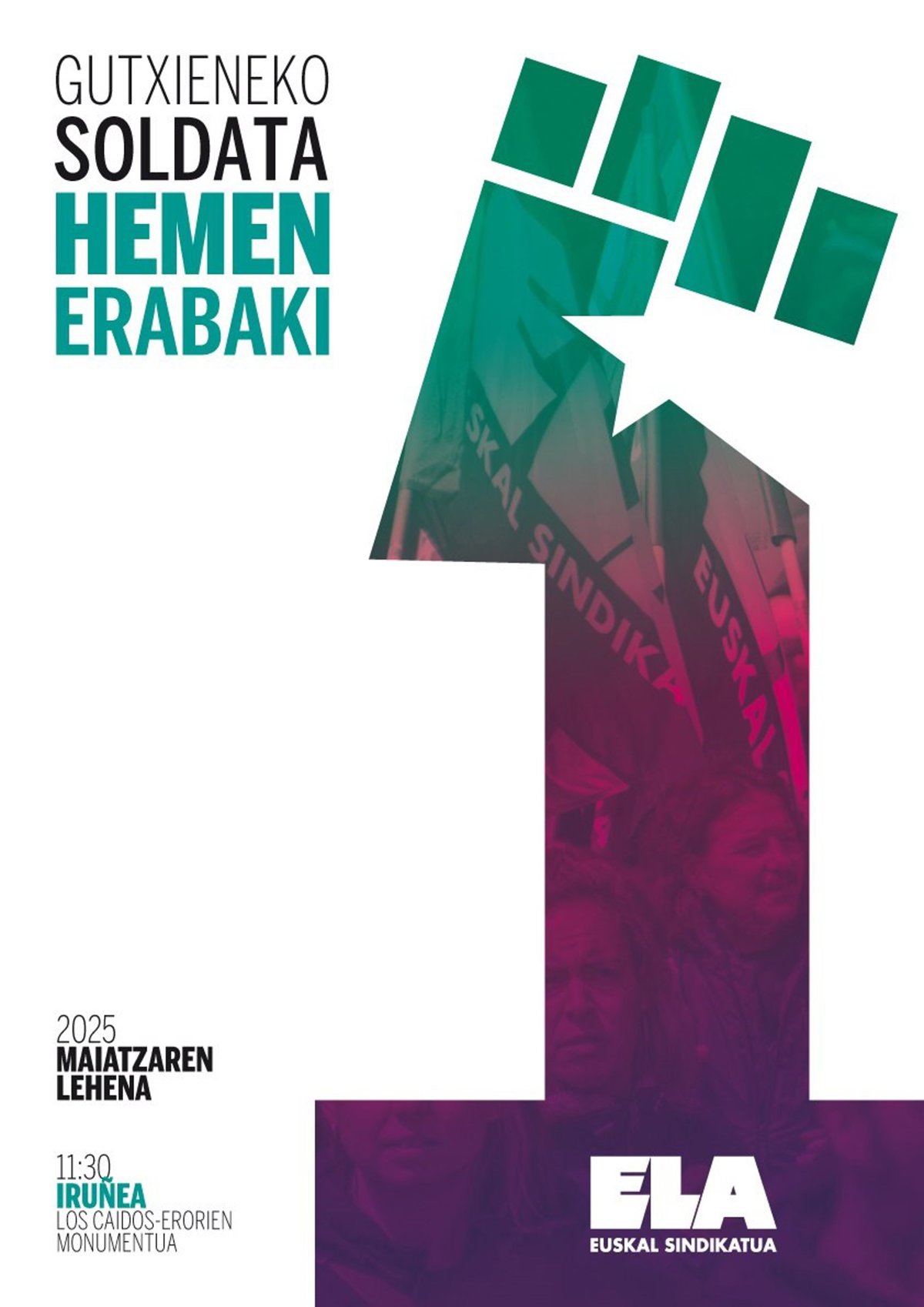 El sindicato ELA se manifestará el 1 de mayo en Pamplona bajo el lema 'Gutxieneko soldata, hemen erabaki' ('El salario mínimo se decide aquí'), reivindicando un SMI propio y la demolición del monumento a los Caídos.