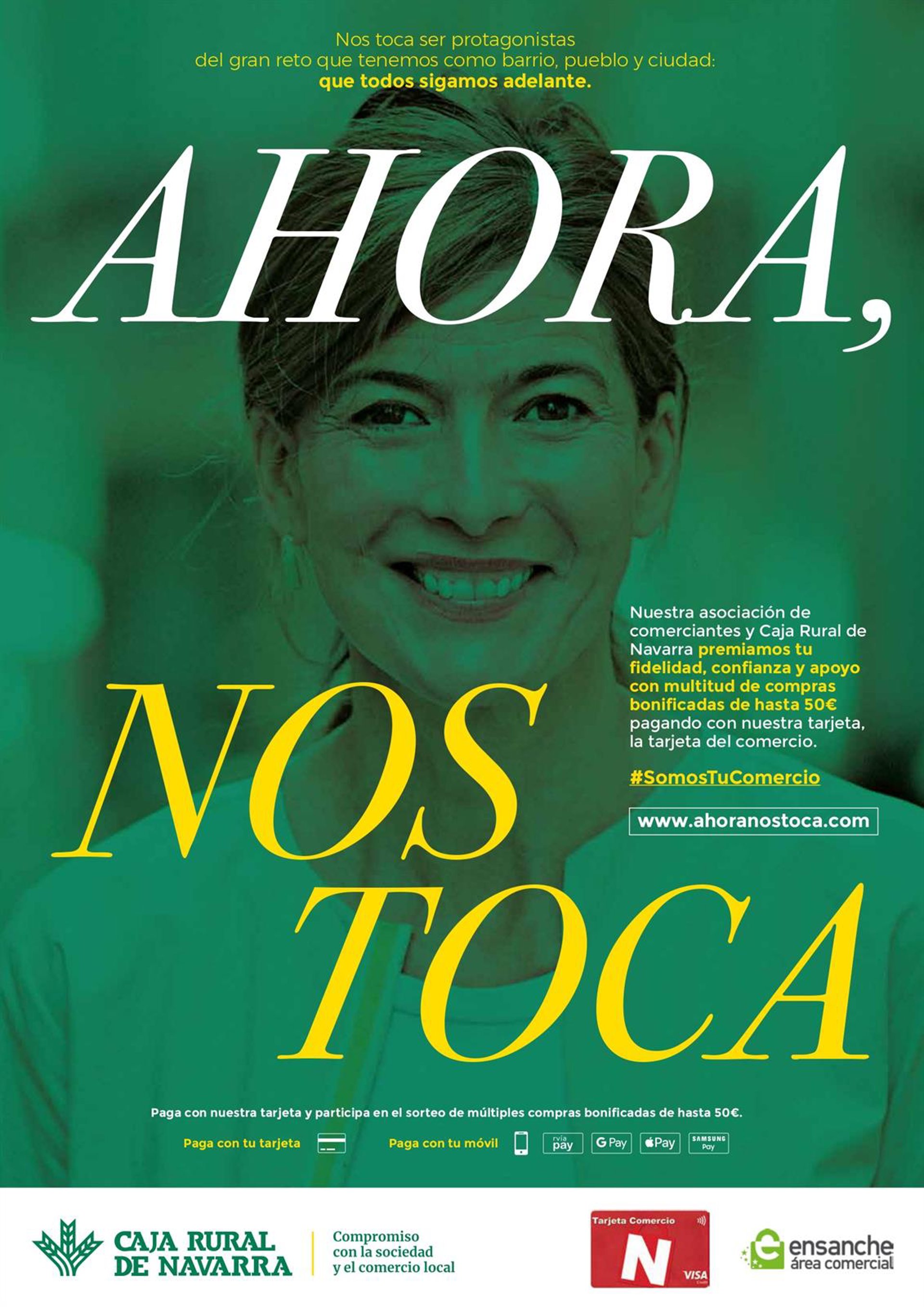 Este lunes, 1 de junio, la Asociación Ensanche Área Comercial, en colaboración con Caja Rural de Navarra, dará comienzo a la campaña 'Ahora nos toca', su primera campaña tras el confinamiento, por la que comprando con la Tarjeta Comercio de Caja Rural de Navarra se podrán obtener multitud de compras bonificadas de hasta 50 euros, cuyo importe se ingresará en la tarjeta del cliente. Habrá bonificaciones de diferente importe: 5, 10 y 50 euros por compra.