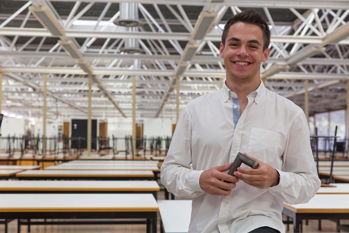 El estudiante de Diseño Pablo Pérez con su prototipo de martillo plegable de acero al carbono y madera - UNIVERSIDAD DE NAVARRA - Archivo
