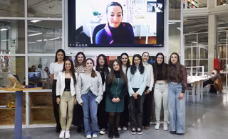 Las estudiantes que han presentado sus trabajos posan junto a la protagonista del vídeo, Marta Melero (en pantalla). - UPNA