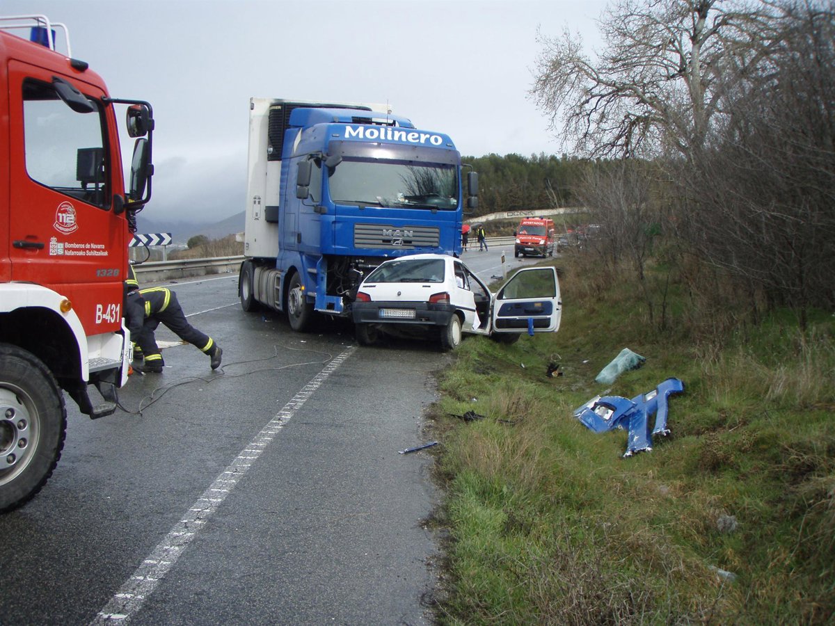 Tras el impacto, el coche ha quedado situado parcialmente debajo del camión y efectivos del Servicio de Bomberos de la Agencia Navarra de Emergencias han tenido que desatrapar después el cuerpo sin vida de la mujer fallecida.