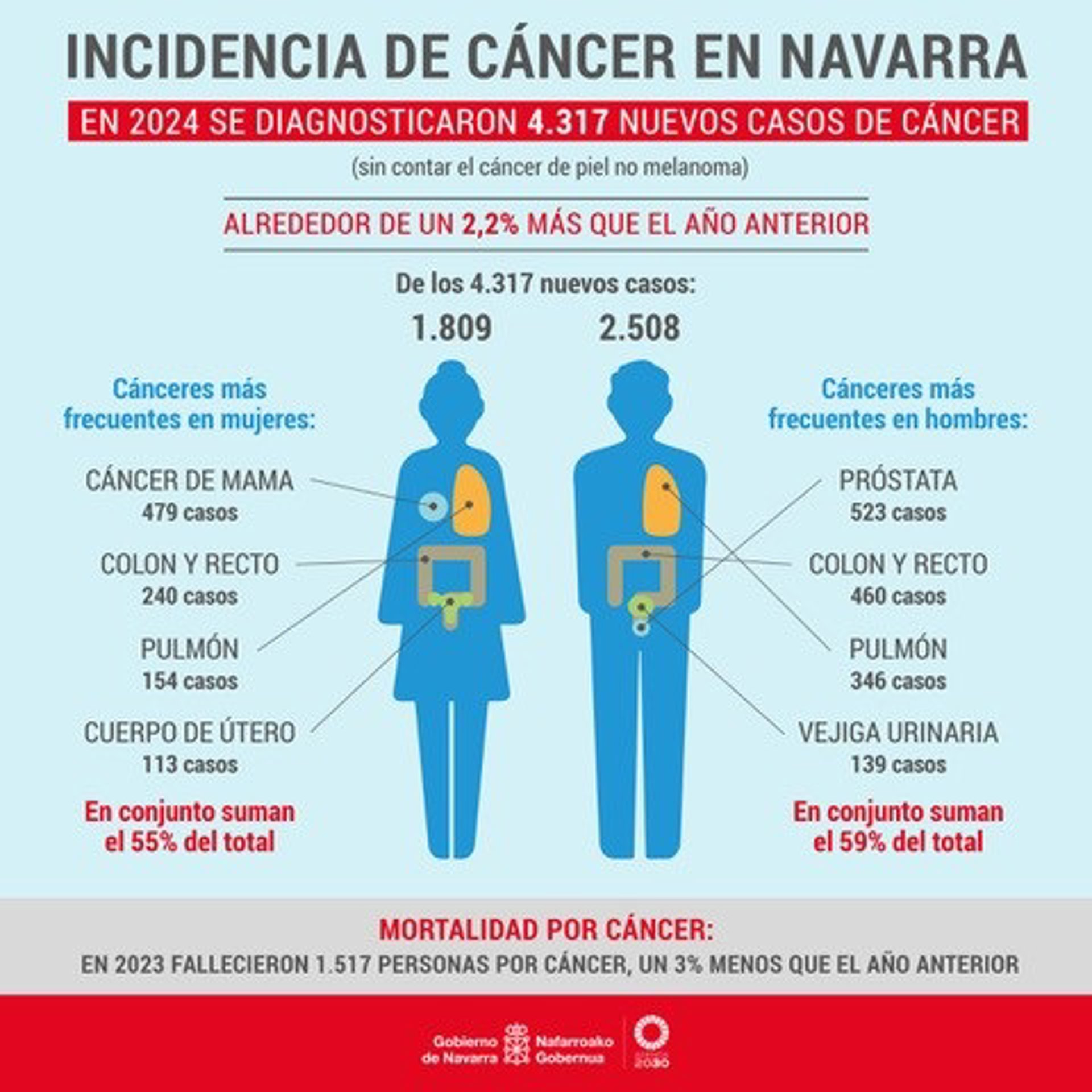 Imagen con los datos de la incidencia del cáncer en Navarra en 2024. - GOBIERNO DE NAVARRA