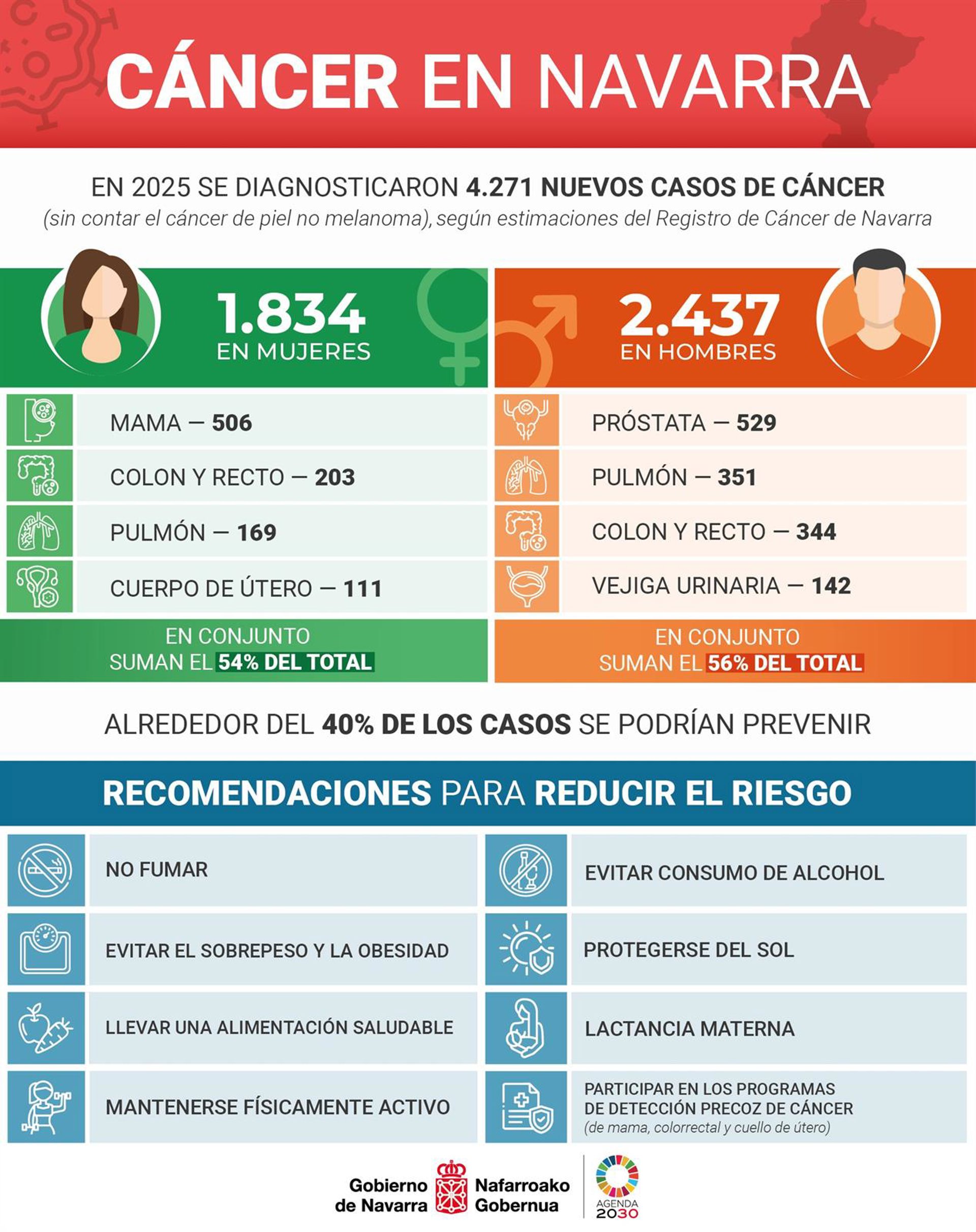 Los estudios científicos estiman que alrededor de un 40% de los casos se podrían prevenir. Por eso, ha indicado el Gobierno foral, es importante trabajar en la promoción de la salud y prevención de estas enfermedades. A nivel individual, para reducir el riesgo de tener esta enfermedad el Código Europeo contra el Cáncer recomienda: no fumar, evitar el consumo de alcohol, evitar el sobrepeso y la obesidad, mantenerse físicamente activo, llevar una alimentación saludable, protegerse del sol, mantener la lactancia materna el mayor tiempo posible, así como participar en los programas de detección precoz de cáncer de mama, colorrectal y cuello de útero, entre otras medidas.