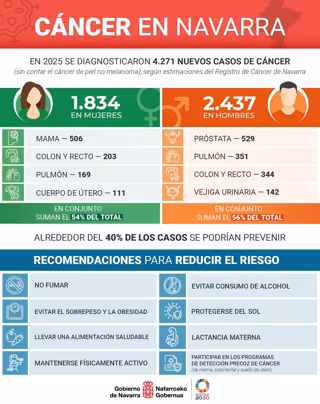 Según se ha explicado, el riesgo o probabilidad de desarrollar un cáncer se incrementa con la edad. En la Comunidad foral se estima que entre el nacimiento y los 50 años es de alrededor del 3% en hombres y 5% en mujeres, aumentando hasta el 44% en hombres y 32% en mujeres entre el nacimiento y los 85 años. Es decir, aproximadamente uno de cada dos hombres y una de cada tres mujeres podrán recibir este diagnóstico a lo largo de la vida, aunque la adopción de estilos de vida saludables se asocia con una reducción sustancial de este riesgo.