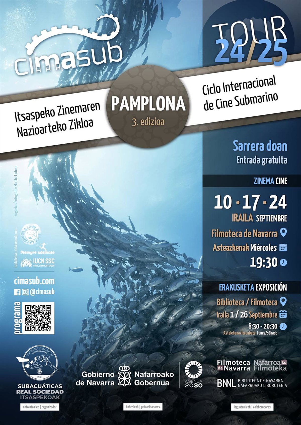 El fondo de los mares llega los días 10, 17 y 24 de septiembre a la Filmoteca de Navarra con CIMASUB, el Ciclo Internacional de Cine Submarino, que mostrará tres sesiones de proyecciones cinematográficas y una exposición de fotografía. Se trata de una iniciativa que buscar ayudar a "tomar conciencia de que la contaminación del ecosistema marino empieza en cada alcantarilla de nuestra ciudad o pueblo".