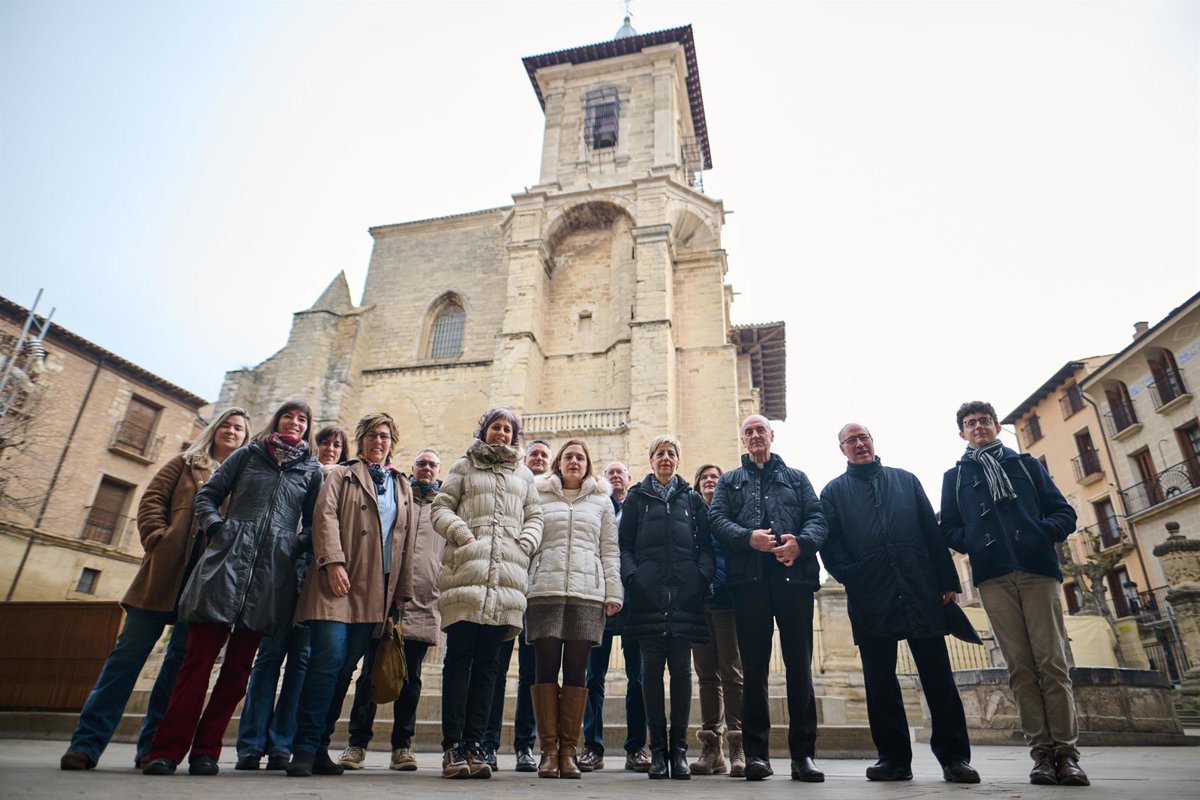 Rebeca Esnaola, junto a la delegada del Gobierno, Alicia Echeverria; la alcaldesa de Viana, Yolanda González; el director general de Cultura, Ignacio Apezteguía; el párroco de la iglesia de Santa María, José Ignacio Hernández, y personal técnico. - MIGUEL OSES