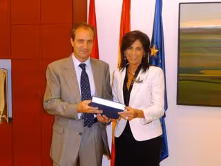 La presidenta del Parlamento de Navarra, Elena Torres, recibió hoy en su despacho oficial al fiscal superior de la Comunidad foral, Javier Muñoz, quien le hizo entrega formal de la Memoria de la Fiscalía Superior de Navarra correspondiente a 2009.