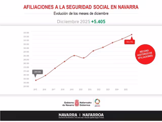 Además, ha indicado, Navarra cerró 2025 con 315.741 afiliaciones, según la afiliación media, son 5.405 personas afiliadas más que hace un año, por tanto, se ha dado un crecimiento anual del empleo del 1,7%. "Navarra cierra el año con balance positivo pese que, en el mes de diciembre, y ya en términos mensuales, la afiliación media ha registrado un descenso de 1.793 personas respecto a noviembre, un -0,56%, siguiendo la tendencia habitual del último mes del año en el que se registra una ralentización de actividades en diversos sectores clave en la Comunidad Foral como la industria", ha añadido.