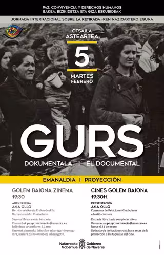 El documental se presentará el próximo 5 de febrero, martes, a las 19.30 horas en los cines Golem Baiona. La entrada es libre hasta completar aforo. Pueden reservarse entradas hasta el 31 de enero en la dirección pazyconvivencia@navarra.es o en el teléfono 848 42 65 22. También podrán retirarse entradas en taquillas desde una hora antes de la proyección, ha informado el Ejecutivo foral en una nota.