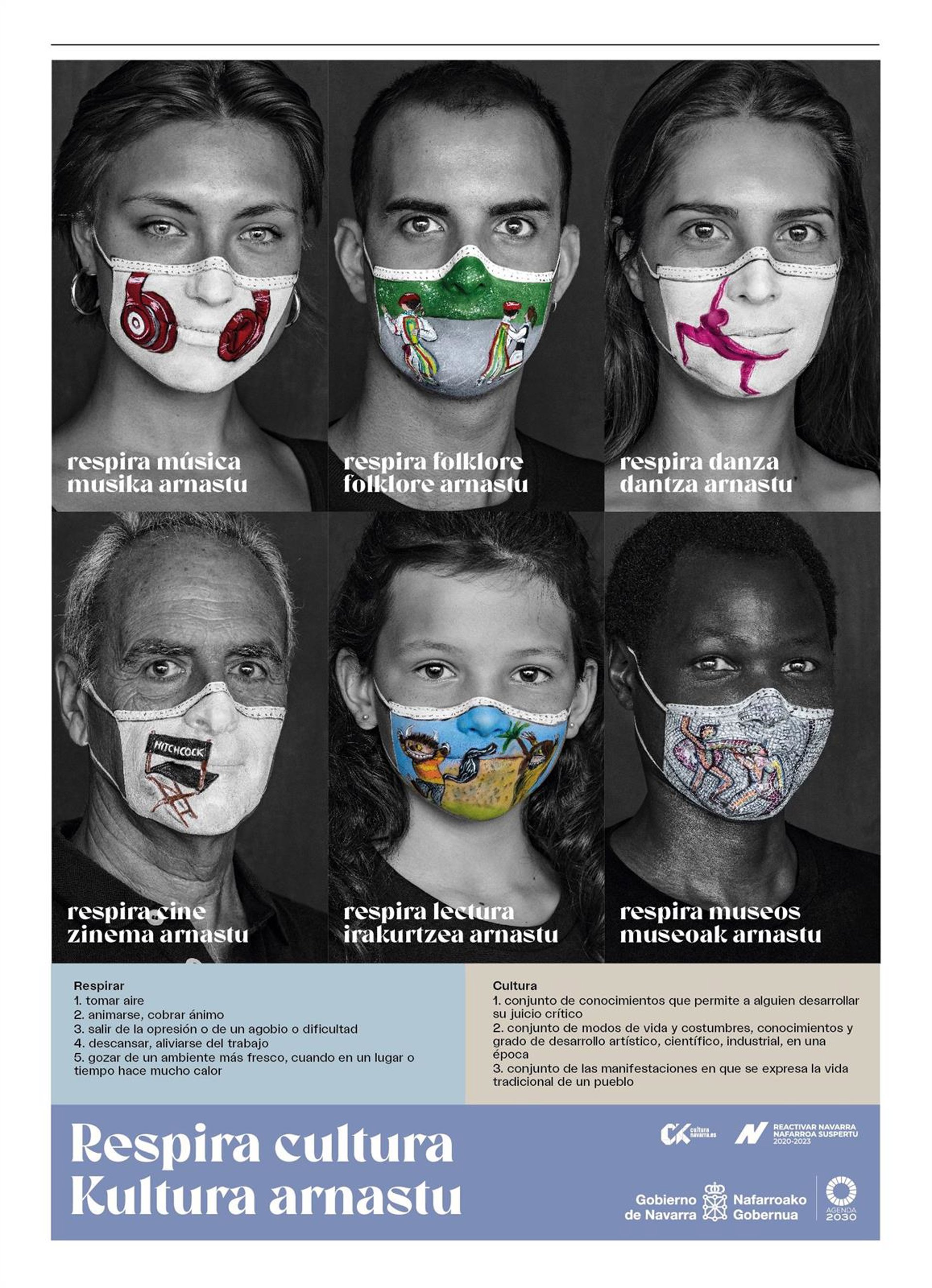 El lema escogido es el de 'Respira Cultura' y en las imágenes que la forman aparecen distintas personas de edades variadas con una mascarilla dibujada en sus rostros con motivos alusivos a diferentes ámbitos de la cultura, como la música, la literatura, la danza, el cine, el patrimonio, el teatro, el arte, o el folklore. La campaña está alineada con el Plan Reactivar Navarra 2020-2023.