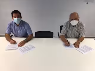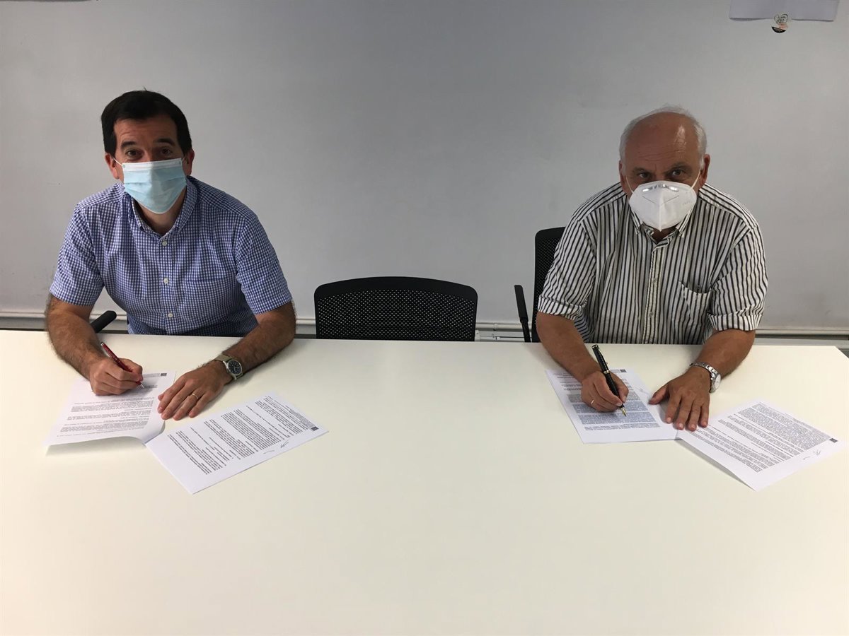 El director general de Acción Exterior, Mikel Irujo, y el director general de la Fundación ADItech, Juan Ramón de la Torre, durante la firma del convenio - GOBIERNO DE NAVARRA