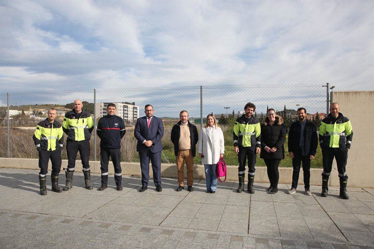 El consejero Javier Remírez, el alcalde de Tafalla, Jesús Arrizubieta, y la directora general, Amparo López, junto a efectivos de bomberos. - GOBIERNO DE NAVARRA