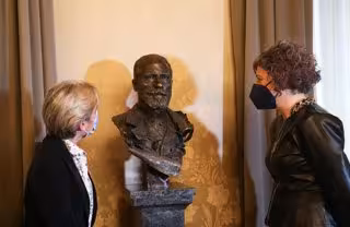 La concejala María García Barberena y la consejera Esnaola, observan el detalle del busto de Julián Gayarre. - GOBIERNO DE NAVARRA