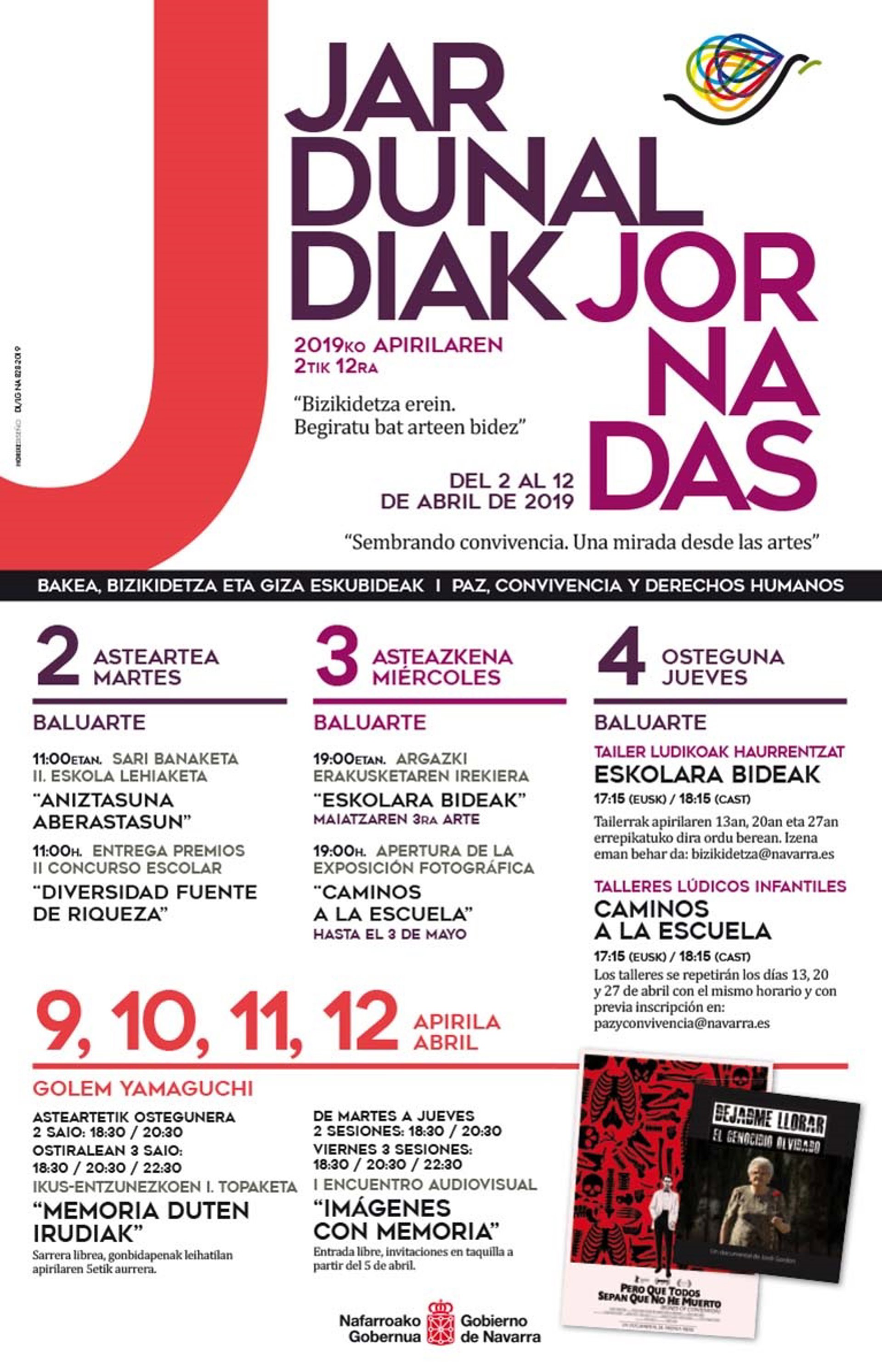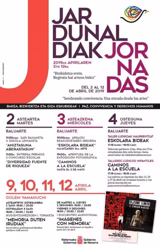 El Gobierno de Navarra ha organizado las IV Jornadas de Paz, Convivencia y Derechos Humanos que se van a celebrar entre los próximos 2 y 12 de abril con diferentes propuestas que "se sirven de la fuerza expresiva del arte para promover una reflexión sobre el respeto de la dignidad de las personas y la defensa de los Derechos Humanos".