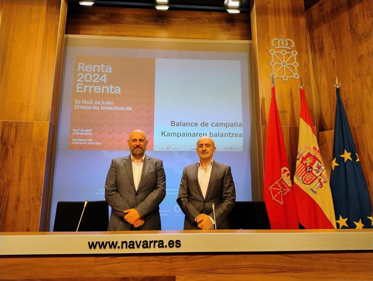 El consejero de Economía y Hacienda del Gobierno de Navarra, José Luis Arasti (i), y el director gerente de Hacienda, Óscar Martínez de Bujanda, en la presentación del balance de la Campaña de la Renta 2024. - GOBIERNO DE NAVARRA