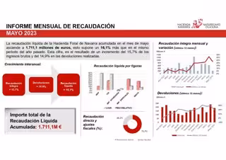 La recaudación líquida de la Hacienda Foral de Navarra acumulada en el mes de mayo asciende a 1.711,1 millones de euros frente a los 1.473,6 millones ingresados en mayo del año 2022. Esto supone un incremento del 16,1% en términos interanuales que es el resultado del incremento de la recaudación íntegra en un 15,7% frente a un incremento del 14,9% de las devoluciones.
