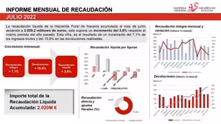 La recaudación líquida de la Hacienda foral de Navarra acumulada en el mes de julio asciende a 2.020,2 millones de euros frente a los 1.960,4 millones de euros ingresados en julio del año 2021. Esto supone un incremento del 3% en términos interanuales, que es el resultado de un incremento de la recaudación íntegra acumulada del 7,1%, que se ve rebajado por el crecimiento superior de las devoluciones del 15,8%.