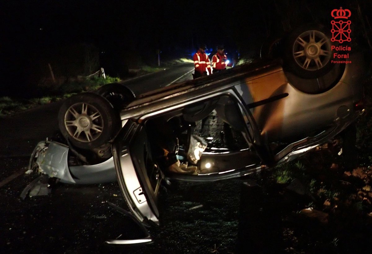 El accidente ha consistido en una salida de vía con posterior choque contra un muro y vuelco de un turismo y en el que un vecino de Baztan de 33 años ha quedado atrapado resultando herido grave. El conductor y único ocupante ha sido trasladado en ambulancia al Hospital Universitario de Navarra, ha informado la Policía Foral.