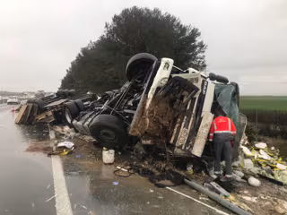 El suceso ha tenido lugar a las 5.33 horas en el kilómetro 35 de la AP15, donde un camión con fruta se ha salido de la calzada y ha volcado. Como consecuencia, el conductor ha resultado herido grave y ha sido trasladado al Complejo Hospitalario de Navarra.