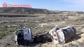 El conductor de un camión de pienso ha resultado herido de levedad este lunes por la mañana tras salirse de la vía y volcar en la NA-125 (Bardenas Reales).