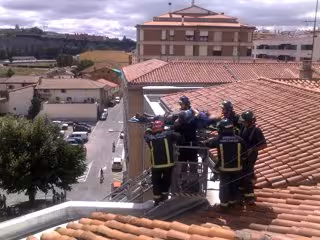 Efectivos del Servicio de Bomberos de la Agencia Navarra de Emergencias (ANE) pertenecientes al parque urbano de Pamplona han acudido con un vehículo de primera salida y el brazo articulado para rescatar al trabajador, de unos 50 años, que permanecía en el tejado.
