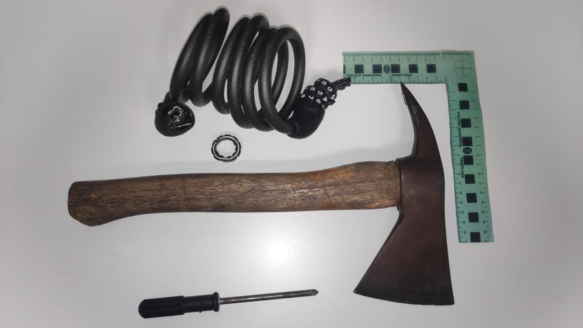 Agentes de Policía Municipal han identificado a un varón que estaba rompiendo el candado de una bicicleta en el edificio Singular de Pamplona y al que se le han incautado un hacha y un destornillador.