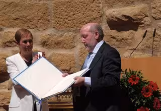El estrado presidencial se ha situado bajo la torre de la iglesia de Santa María, ornado por el pendón del Principado de Viana. Aranguren ha recibido un diploma con grabados al agua del Príncipe Carlos y de Olite.