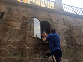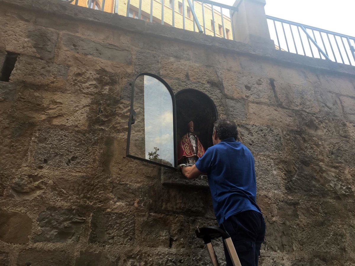La imagen de San Fermín ocupa ya la hornacina de la cuesta de Santo Domingo tras las fiestas. Esta mañana, personal del Ayuntamiento de Pamplona ha vuelto a colocar la imagen habitual del santo que recuerda durante todo el año la devoción de la ciudad a San Fermín. La réplica del santo regresa a su lugar tras haber sido retirada el pasado 5 de julio.