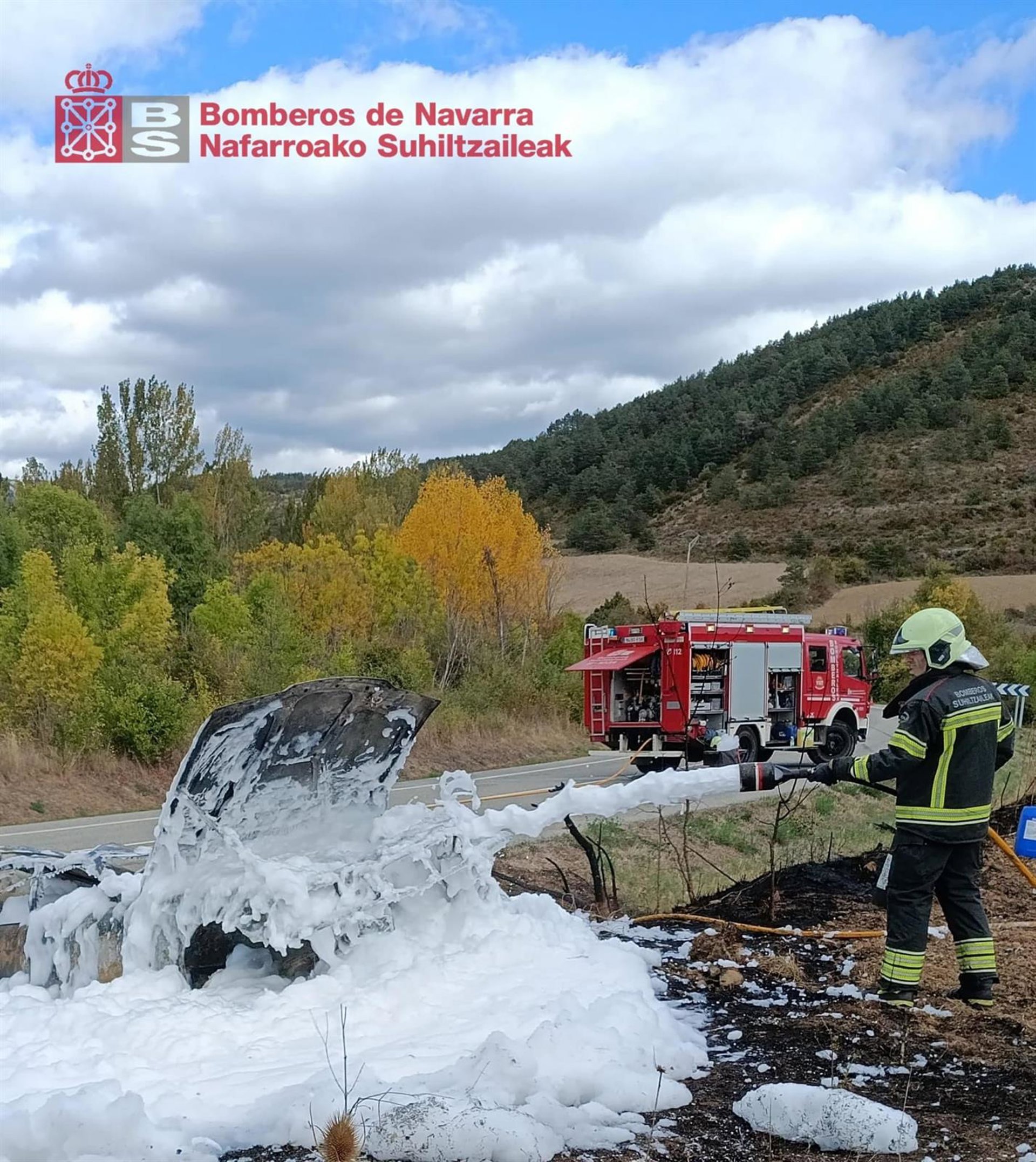 Efectivos de bomberos del parque de Navascués intervinieron este sábado por la tarde para extinguir el incendio de un vehículo que había impactado contra una acequia tras sufrir una salida de vía en la NA-178, en el término municipal de Gallués.