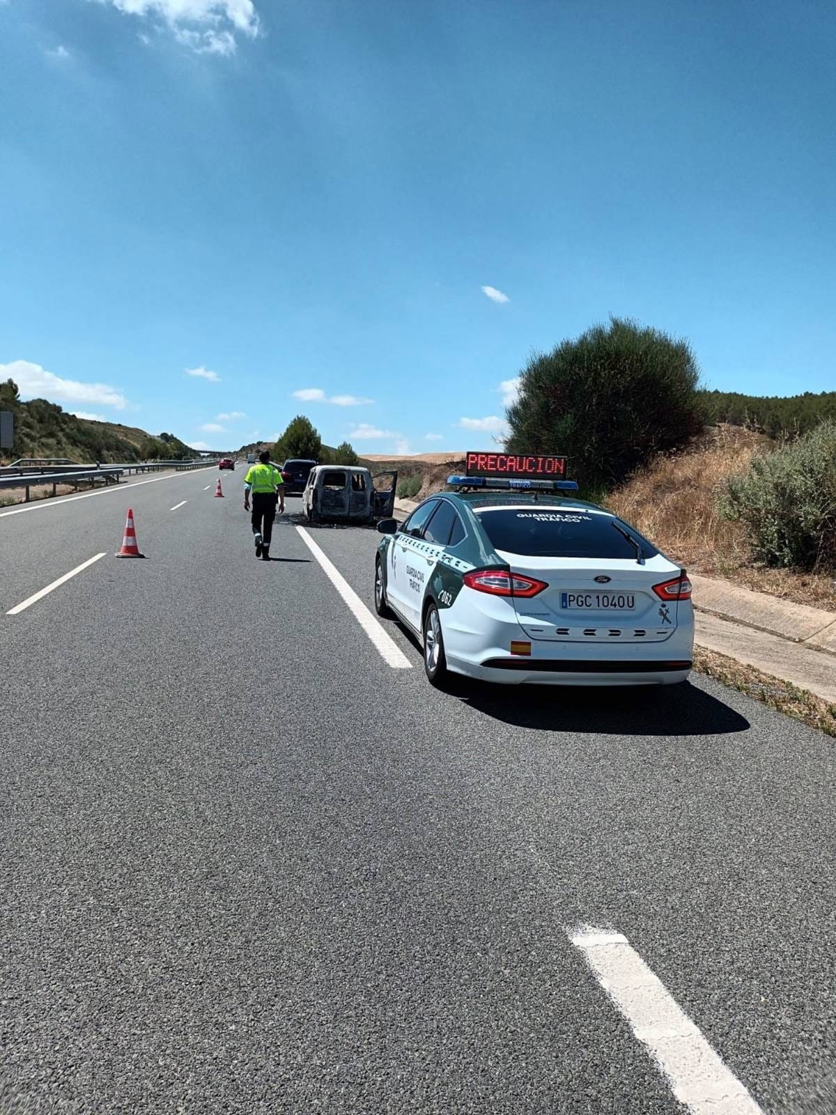 Agentes de la Agrupación de Tráfico de la Guardia Civil de Navarra se han encargado de regular la circulación en esta carretera. Efectivos de bomberos han sofocado las llamas que han afectado a la totalidad del vehículo.