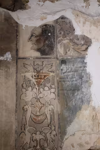 Además de la decoración de grutescos, la estancia ofrecía dos retratos de perfil enfrentados rematando cada una de las dos pilastras. Podrían pertenecer a los promotores de las pinturas, los dueños del palacio o algún antepasado familiar importante. Por el tipo de retrato, nada idealizado, no parecen ser alegorías o representaciones de dioses como en otros casos. En el centro, aunque muy deteriorado, hallamos el cuerpo de un animal al que le faltan las extremidades y la cabeza.