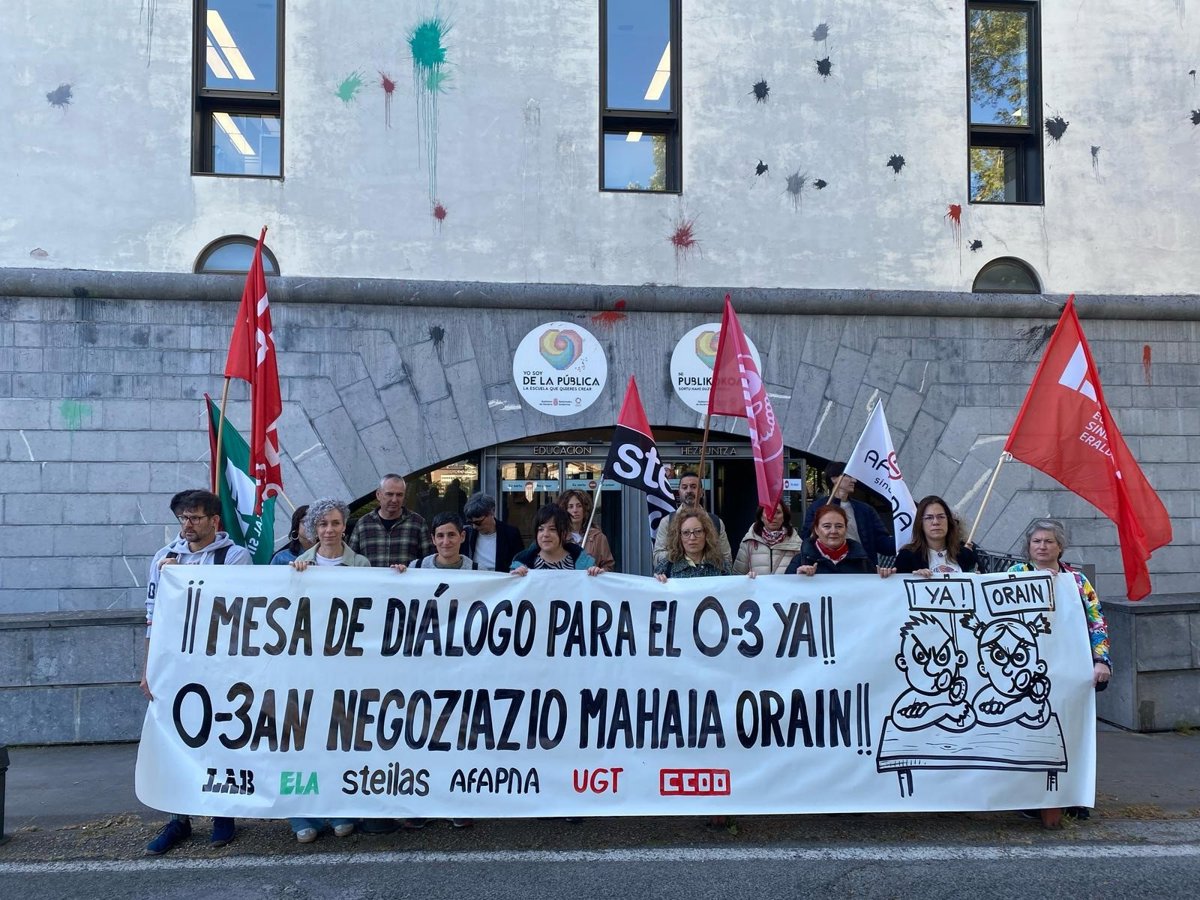 Los sindicatos LAB, ELA, Steilas, Afapna, UGT y CCOO, integrantes de la Intersindical del ciclo 0-3, se han concentrado este miércoles en Pamplona para reivindicar su entrada en la comisión de trabajo que cada segundo miércoles de mes reúne a la Federación Navarra de Municipios y Concejos (FNMC) y al Departamento de Educación del Gobierno de Navarra.