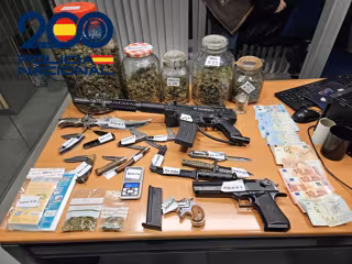Durante el registro los agentes encontraron la sustancia vegetal estupefaciente distribuida en bolsitas de plástico y dinero (unos 300 euros) fraccionado en billetes pequeños. Además, en el trastero fueron intervenidas dos pistolas de airsoft y una réplica de un subfusil y 12 armas blancas, incluyendo cuchillos, machetes y navajas.