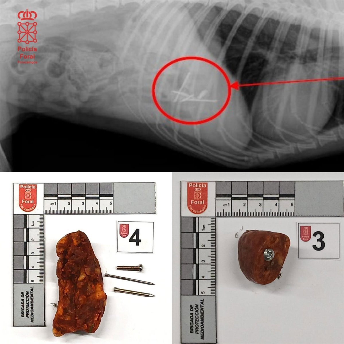 Como consecuencia de estos actos, una perra ingirió uno de los cebos. Tras ser trasladada a un centro veterinario, las pruebas radiográficas confirmaron la presencia de cuatro clavos en su tracto digestivo. El animal tuvo que ser sometido a una intervención quirúrgica de urgencia para salvar su vida y se encuentra bajo un protocolo de recuperación, explican desde la Policía Foral.