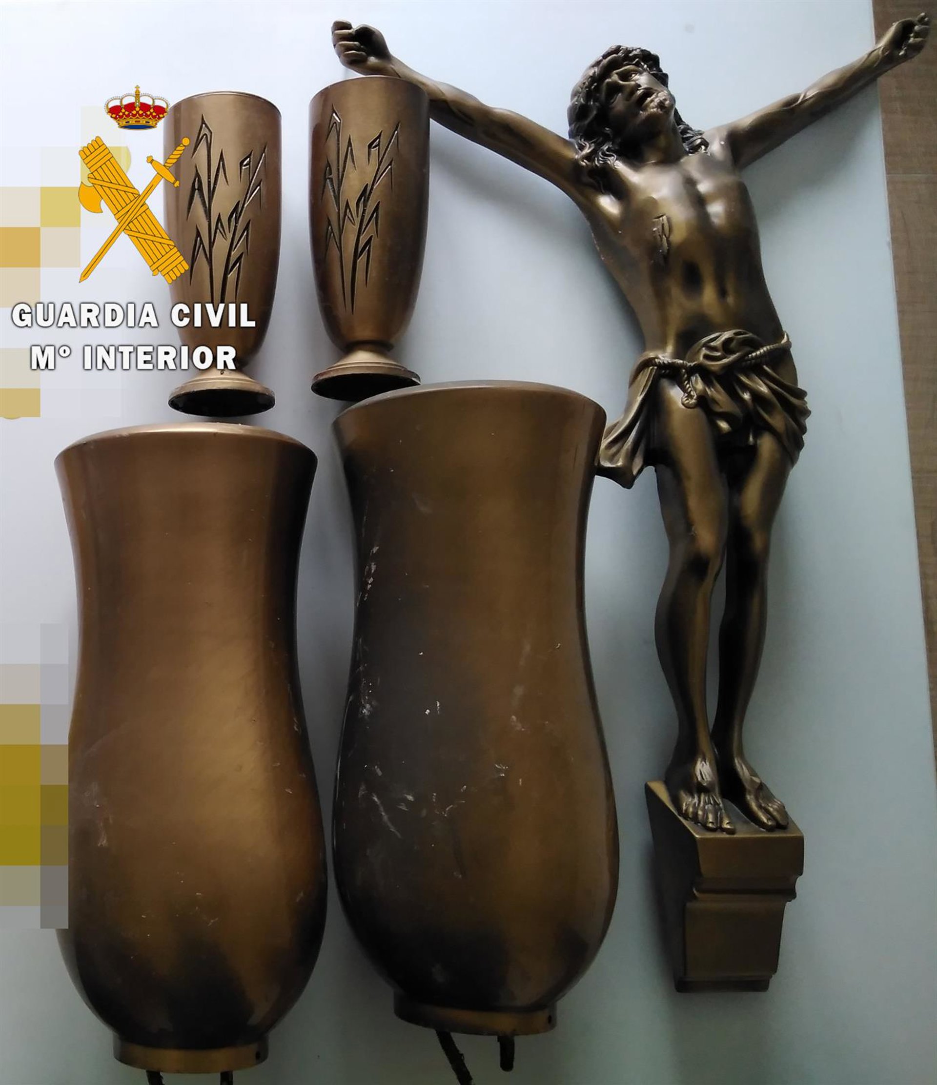 Se realizó una inspección en el centro de reciclaje en el que se observó que la persona ahora investigada, además de los dos jarrones presuntamente sustraídos en el cementerio de Peralta, entregó otros dos jarrones más pequeños y un crucifijo, todos ellos de bronce, que fueron aprehendidos por la Guardia Civil por poder estar relacionados con más hechos delictivos en la zona.