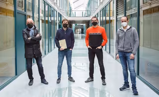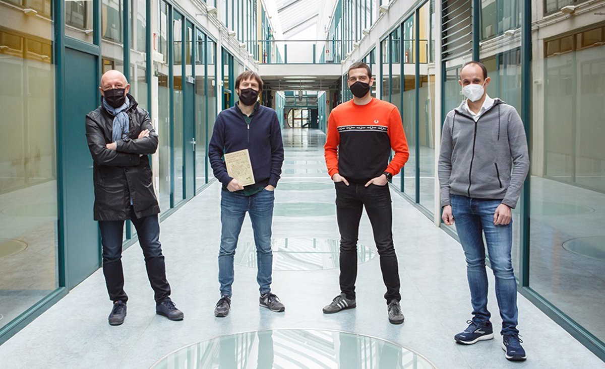 Los autores del capítulo sobre la familia Yeregui, en la UPNA. De izda. A dcha Jesús María Pintor, Jokin Aginaga, Adrián Claver y Xabier Iriarte - UPNA