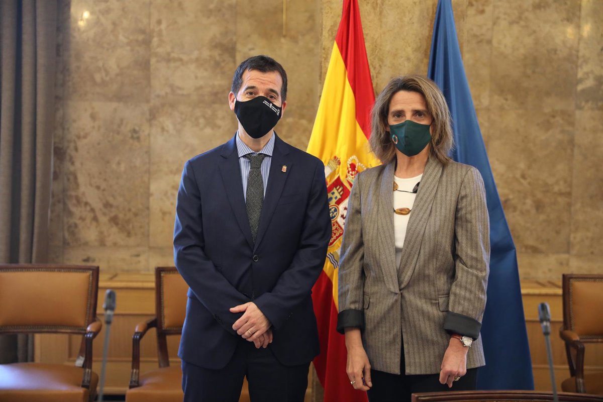 El consejero de Desarrollo Económico y Empresarial, Mikel Irujo, y la vicepresidenta cuarta, y ministra para la Transición Ecológica y el Reto Demográfico, Teresa Ribera, han mantenido una reunión este jueves en Madrid para conversar sobre los proyectos estratégicos por los que apuesta Navarra para los fondos de recuperación y resiliencia europeos Next Generation.