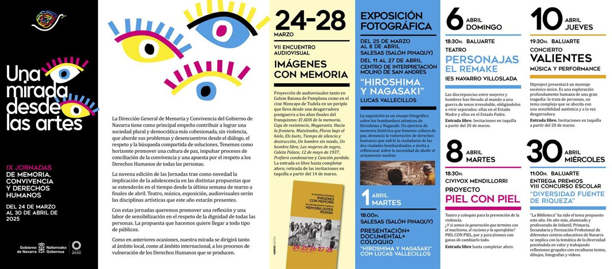 El Departamento de Memoria y Convivencia, Acción Exterior y Euskera del Gobierno de Navarra ha presentado las IX Jornadas de Memoria, Convivencia y Derechos Humanos 'Una mirada desde las artes', que se desarrollarán desde el 24 de marzo hasta el 30 de abril con el fin de "promover la sensibilización y el respeto a las personas a través del arte".