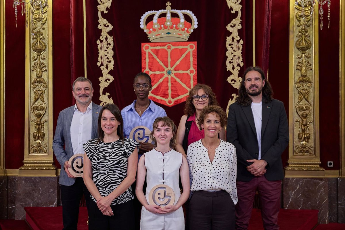 Jara Liras y el resto de premiados en los Galardones de Juventud de Navarra, con la presidenta del Gobierno foral, María Chivite, y la vicepresidenta tercera Begoña Alfaro. - JESÚS M GARZARON
