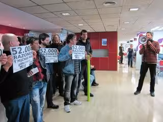 Además, miembros del sindicato LAB han colgado pancartas en la fachada de la oficina con los lemas 'España=paro' y 'M29 Greba orokorra (huelga general) 52.000 razones'.