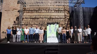 El director general de Cultura del Gobierno de Navarra, Ignacio Apezteguía; las directoras artísticas del Festival, Ane Pikaza y María Goiricelaya; y el alcalde de Olite, Josu Etxarri Sueskun, han presentado el inicio del certamen en el escenario de La Cava. Han estado acompañados por miembros de algunas de las ocho compañías navarras participantes en esta edición _Qabalum, Iluna Producciones, Ion Iraizoz, Lore More, La Trapecionista, Estefanía de Paz Asín, Producciones Maestras_ y también por representantes de Fundación Baluarte y de las localidades de Tafalla, San Martín de Unx y Beire.
