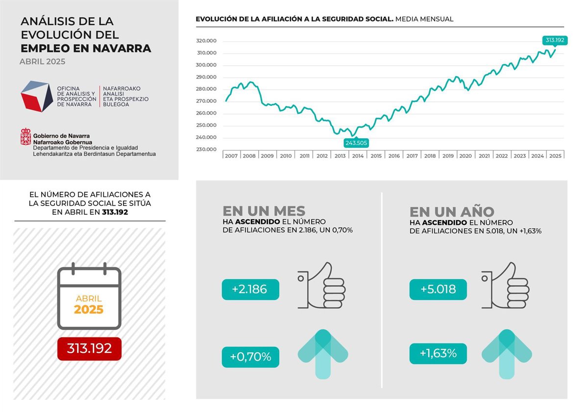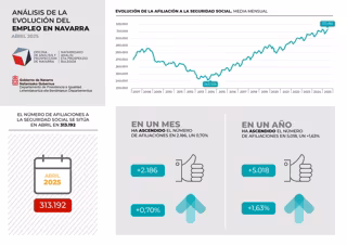 En cuanto a la afiliación, ha indicado el Ejecutivo, se ha dado "un significativo crecimiento", respecto a marzo 2.186 afiliaciones más, un +0,70%. En términos anuales, hay un 1,63% más de afiliaciones, en concreto 5.018 más. "De este modo se alcanza la cota máxima histórica de empleo en Navarra, situándose la afiliación media del mes de abril en las 313.192 afiliaciones", ha indicado, para añadir que el nivel de empleo "se sitúa en niveles históricos y se consolida la creación de empleo".