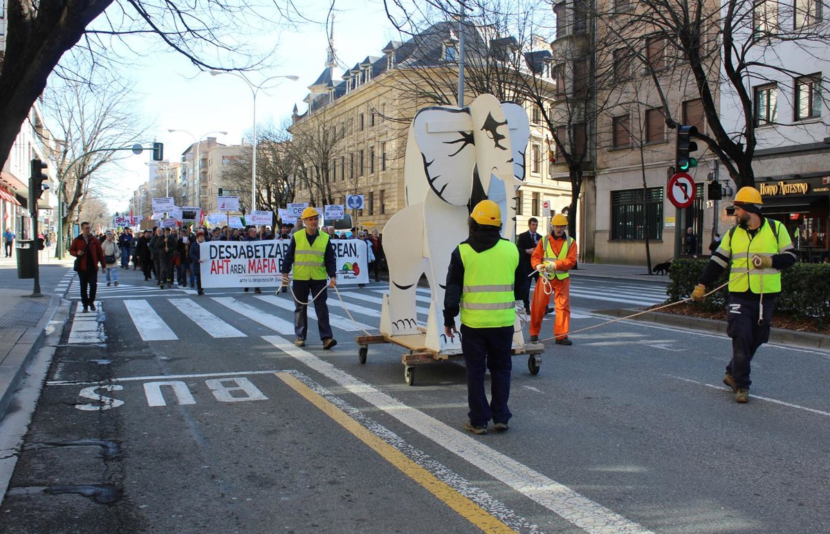La movilización ha partido desde el Palacio de Navarra, bajo el lema 'Ante la desposesion, ¡luchemos contra la mafia del TAV!' y ha contado, según los convocantes, con la participación de unas 500 personas. La marcha ha sido encabezada por la figura de un elefante blanco, "símbolo internacional de las infraestructuras inútiles, destructoras e impuestas".
