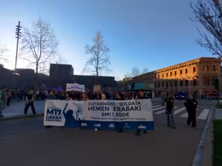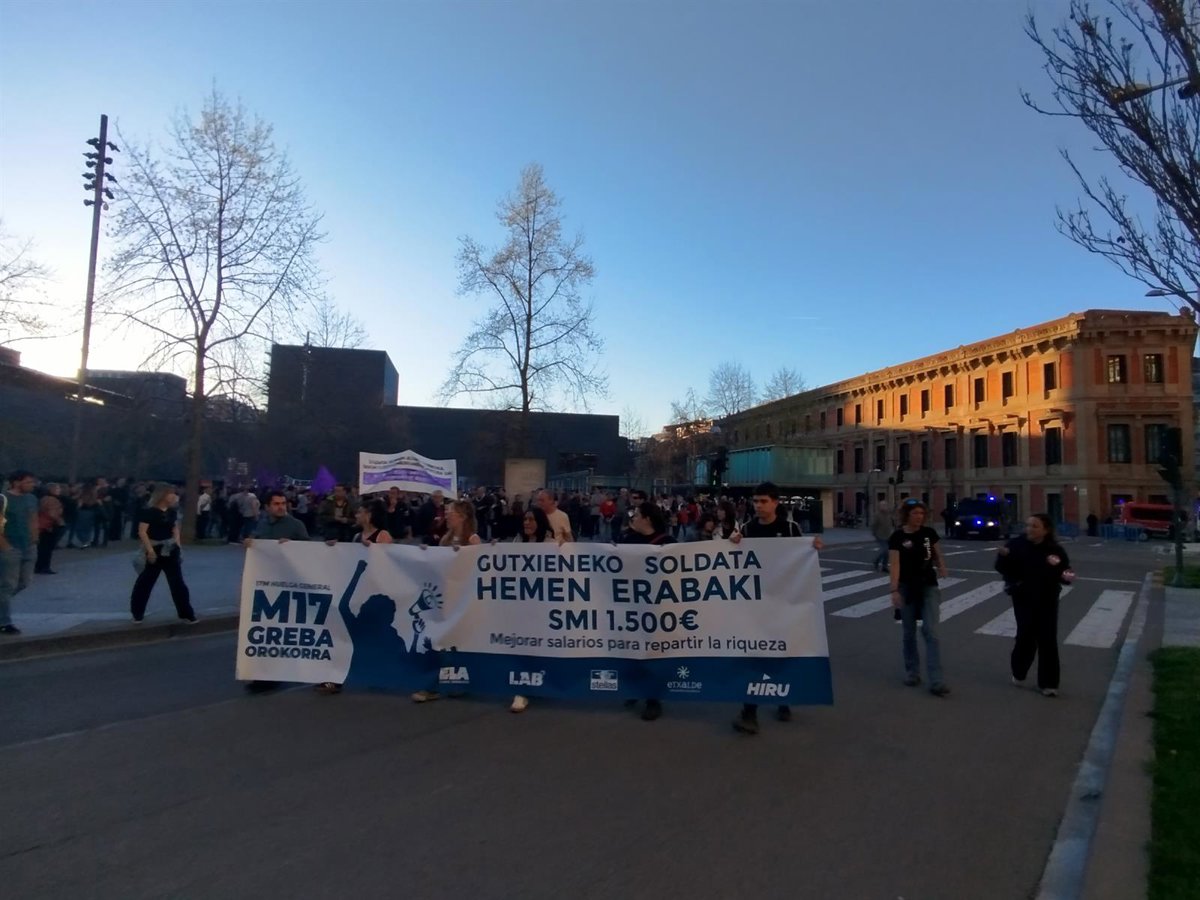 En la manifestación, que ha partido pasadas las 18.35 horas desde la Plaza de la Constitución, junto a Baluarte, tras una pancarta con el mensaje 'Gutxieneko soldata hemen erabaki. SMI 1.500. Mejorar salarios para repartir la riqueza', han participado diferentes colectivos sociales y sindicales.