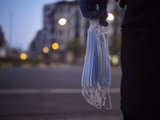 Un policía nacional se prepara para entregar mascarillas a los pasajeros de transporte público urbano de Pamplona el día en el que se reactiva la actividad laboral no esencial en Navarra en las empresas cuyos empleados no puedan teletrabajar cuando se c - Eduardo Sanz - Europa Press - Archivo