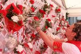 Numerosas familias se han acercado a las 11.00 horas a las inmediaciones de la iglesia de San Lorenzo para ofrecer flores rojas y blancas a la réplica del 'santo morenico' y formularle sus deseos y peticiones.